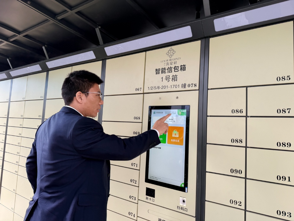 走进苏州工业园区保利·天和珺庭小区,主入口右侧通道里,一排米白色的智能信包箱格外醒目,箱体上配有灯带、操作屏、摄像头,科技感十足。一位年轻妈妈抱着孩子前来取件,掏出手机在屏幕上轻轻一点,箱门自动弹开,整个过程不到10秒。“平时网购多,我一周要取十几件,这个柜子就在小区门口,带娃遛弯时就顺手把快递取了,很方便。”