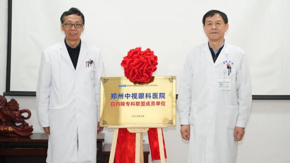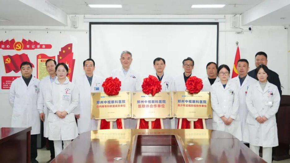 仪式现场,上蔡恒春医院领导成员与郑州中视眼科医院专家团队——国内知名眼科专家张金嵩教授、侯习武教授、刘德成主任共同出席并见证了这一重要时刻。双方领导共同签署合作协议,并隆重揭牌 “郑州中视眼科医院医联体合作单位”、“白内障专科联盟成员单位”、“青少年近视防控协作单位” 三块牌匾,正式开启技术、人才、管理全方位深度协作的新征程。