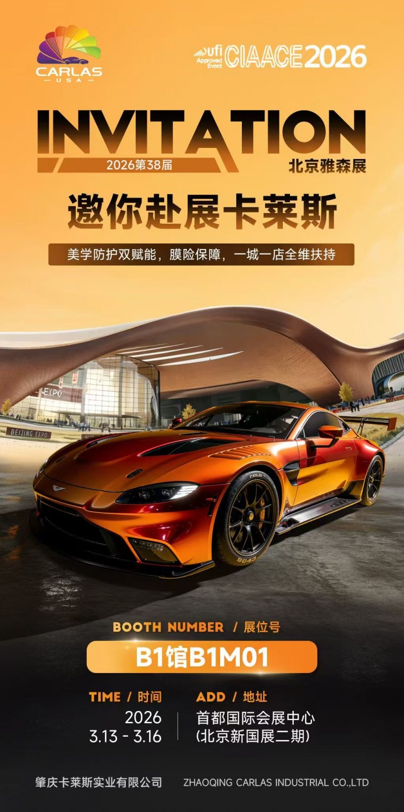 北京,2026年3月——作为汽车后市场开年的风向标,第38届中国国际汽车服务用品及设备展览会(简称“雅森展”)于2026年3月13日在北京·首都国际会展中心启幕。专注于汽车膜领域近三十年的肇庆卡莱斯实业有限公司(品牌:卡莱斯CARLAS)确认参展,在B1馆B1M01展位展示其最新的TPU改色产品及商业模式。