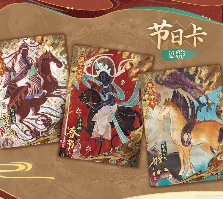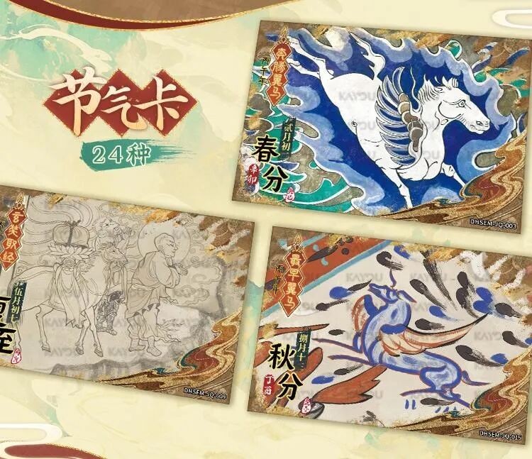 敦煌文化中有关马的经典作品被选取出来,呈现在了卡牌的纸面上。“十二马卡”,即是把这些画作分门别类,浓缩成12张卡牌,每张卡面对照1个丙午年农历月,既能单独欣赏,也能插放在限定发行的2026年农历敦煌壁画台历上,兼具卡册的实用功能与美感。在日期卡的基础上,卡游还特别设计制作了24张节气卡和8张节日卡。