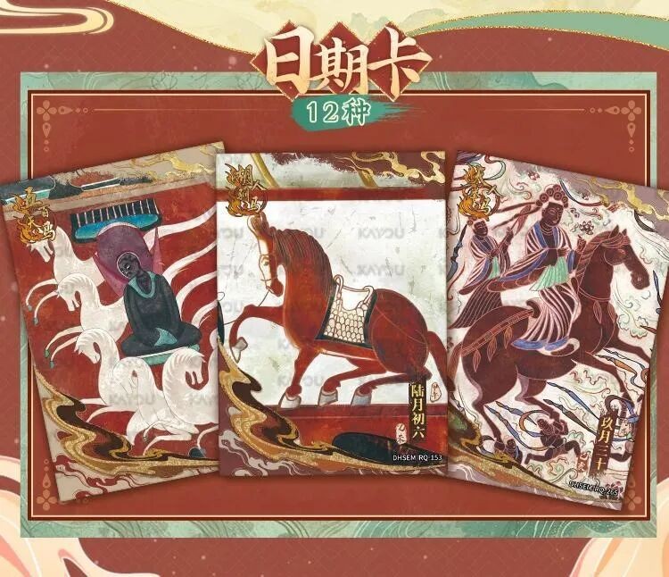 浩如烟海的敦煌艺术中,经变画、故事画、飞天、菩萨与瑞兽是最具代表性的主题,而正好呼应即将到来的农历马年,卡游于元旦推出的首款联名产品《敦煌十二马卡》,就是集结了敦煌壁画中有关马的创作,进行了一次系统的“马文化”梳理。