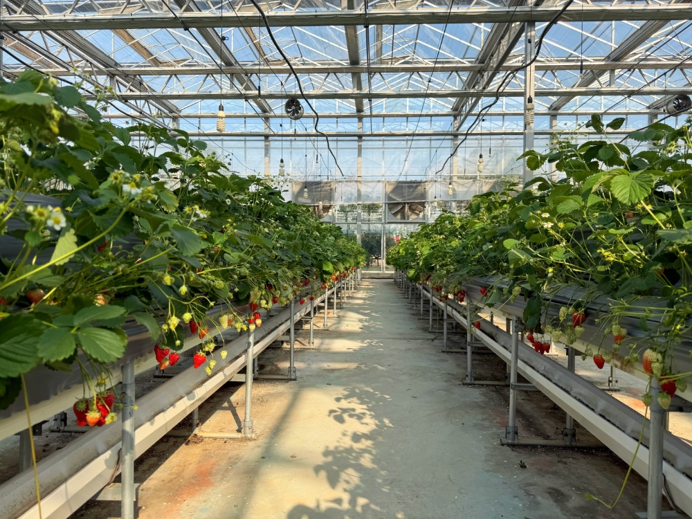 与传统种植模式不同,“物联网”让大棚颇具科技范儿。在这里,草莓生长在高架上,土壤温度、湿度以及光照强度实时显示在大屏上。“这些数据我在手机上都能实时收到和调节。”王柏生说。他种草莓近40年,除了积极引进省农科院育成的紫金香雪等新品种,也十分重视种植技术的绿色化、现代化。目前,农场获评国家级生态农场、全国农作物病虫害绿色防控技术示范推广基地,他本人也获评江苏省劳模。“同样的土地,我们向空中发展,目前平均亩产达2000公斤,还供不应求。”