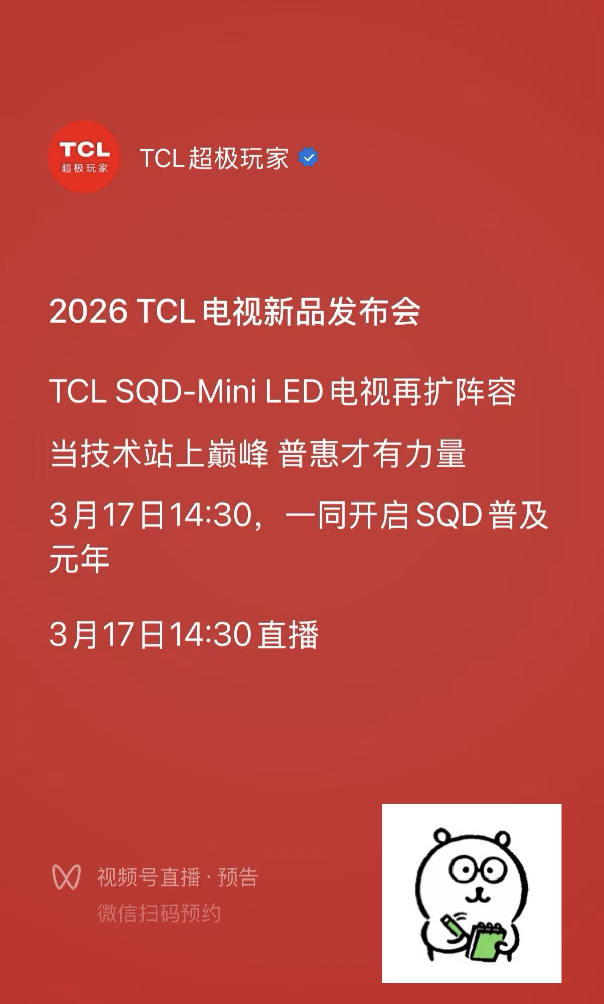 好了,到这里必须给准备买电视的小伙伴提个醒:别着急下手!3月17日14:30的TCL SQD-Mini LED电视春季新品发布会一定要蹲住,这三款搭载旗舰级SQD-Mini LED技术的新品,绝对能满足你对好画质的所有期待。2026年将是SQD-MiniLED电视普及元年,不用再为选择画质而纠结,真正好画质认准SQD电视,跟着TCL的步伐,花更少的钱,享受顶尖的画质体验,锁定3.17发布会,除了已经透露的新品,还有哪些隐藏惊喜,先蹲为敬!