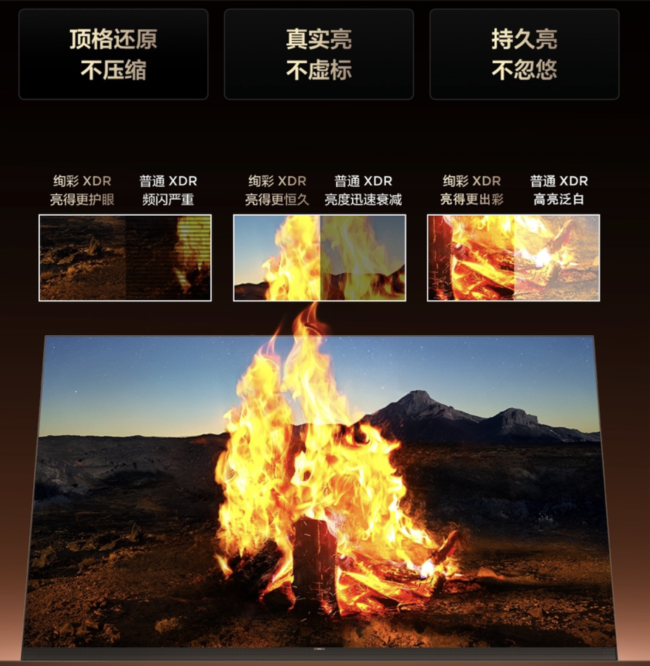 再看峰值亮度,SQD-Mini LED搭载的绚彩XDR技术,能实现持久稳定的高亮输出。不管是白天阳光直射客厅,不用拉窗帘也能看清屏幕细节,还是晚上观看HDR影片,阳光、烛光、金属反光等高光场景都能完美还原,100%还原所有HDR片源效果,再也不会出现亮一下就骤暗的情况。