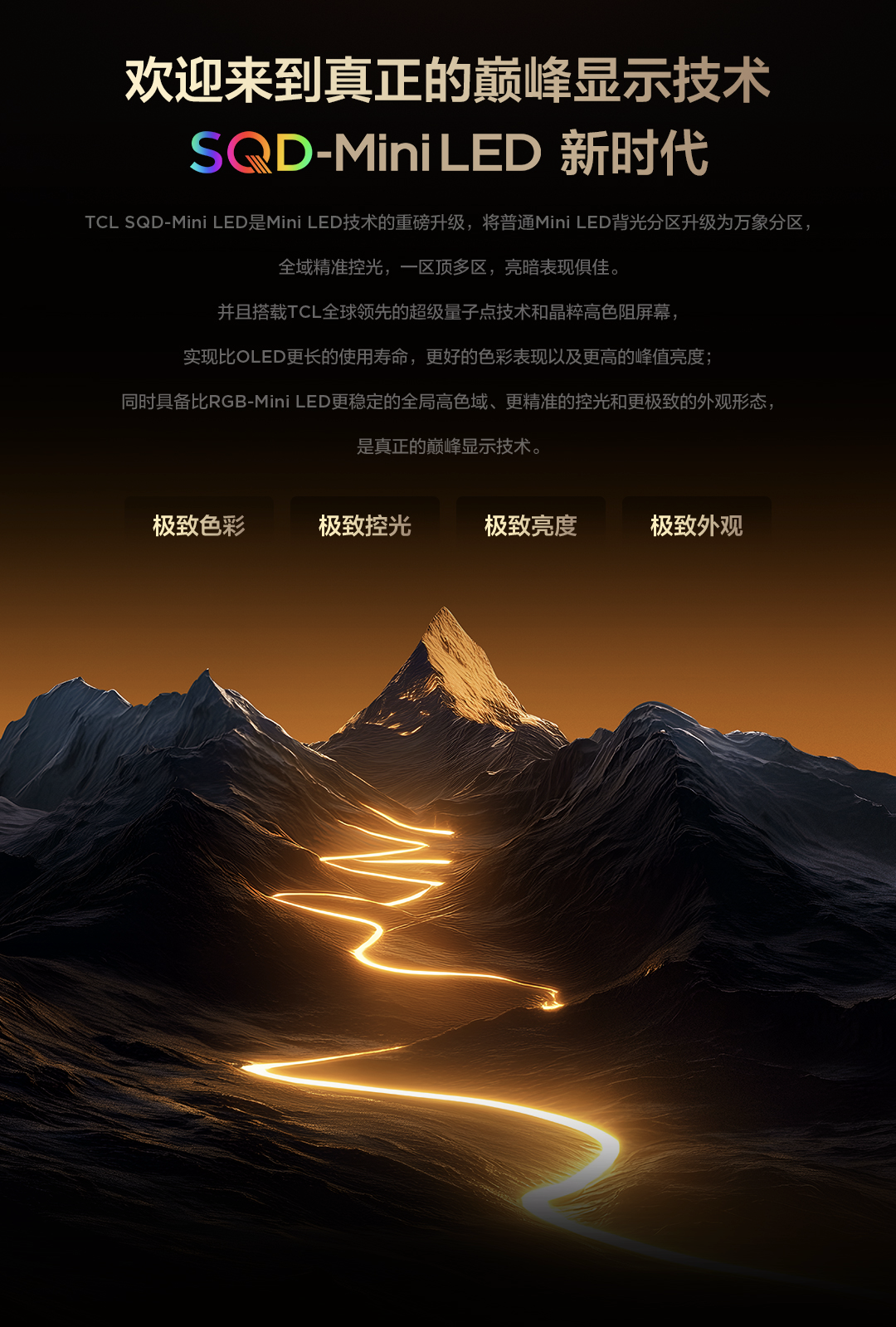 可能有小伙伴会问,为什么是SQD-Mini LED为电视画质带来代际革命呢?答案很简单,因为背后站着的是TCL这座“技术大山”。熟悉电视圈的朋友都知道,TCL从来不是跟风者,而是实打实的技术领跑者和开创者——从Mini LED技术、QLED量子点技术,到QD-Mini LED技术、第四代液晶电视,每一次技术突破都在改写行业格局,更是大屏电视领域的绝对领头羊。