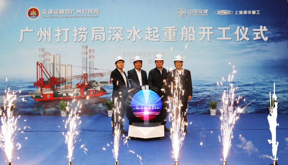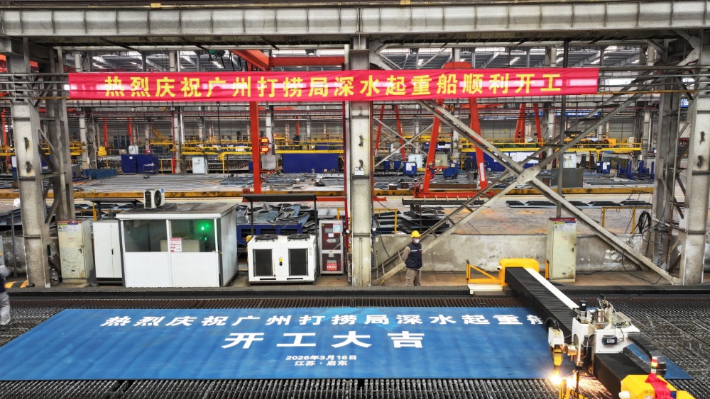 交汇点讯 3月16日,上海振华重工集团为广州打捞局建造的国内在建最高、最深的插桩式深水起重船在启东振华海工开工。