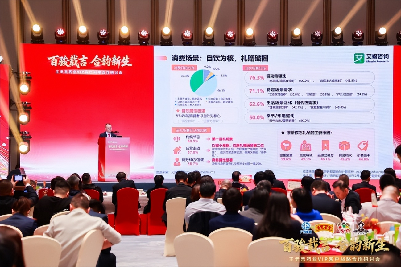 这场以“百骏载吉 含韵新生”为主题的盛会,汇聚了王老吉药业核心领导、VIP客户代表及行业专家,不仅搭建了品牌与合作伙伴深度沟通、共商发展的桥梁,更依托艾媒咨询在大数据洞察、AI智能决策、行业智库研究等领域的优势,为王老吉的数智化转型与市场拓展精准赋能。