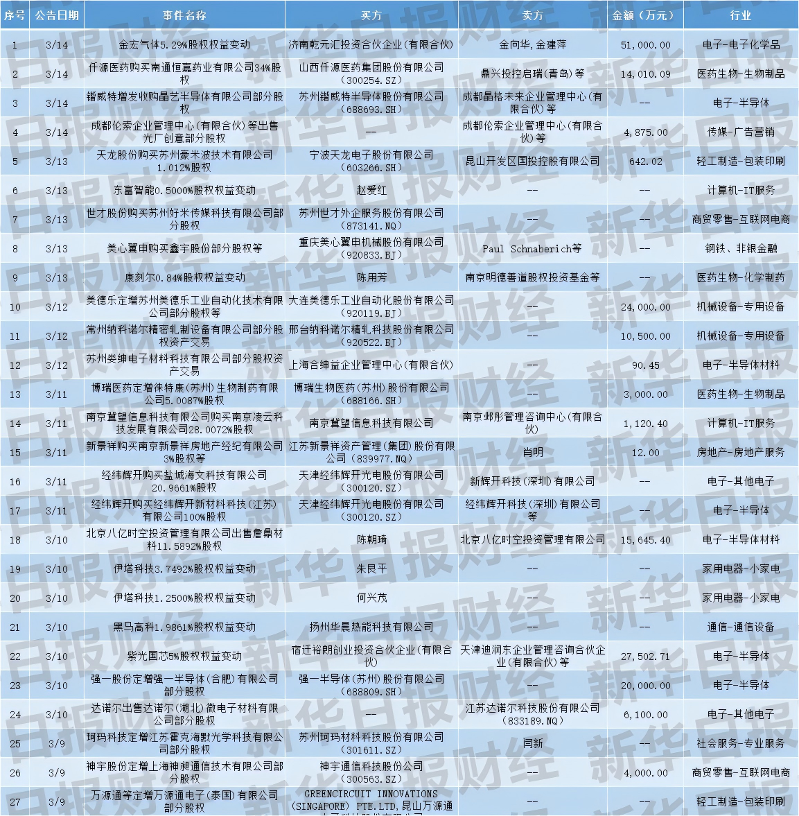 最活跃领域:电子/半导体(10笔)、医药生物(3笔)、机械设备(3笔)。