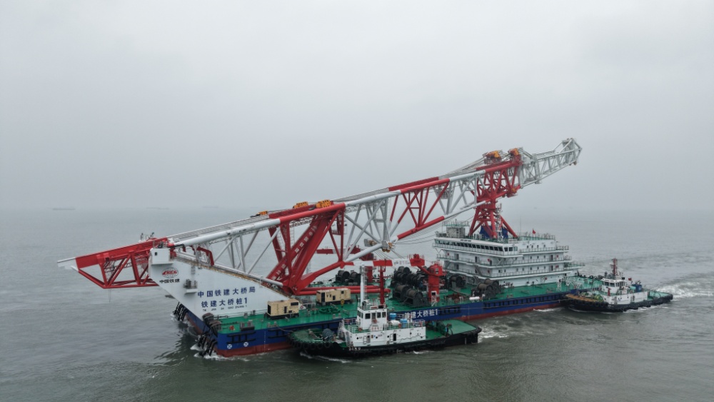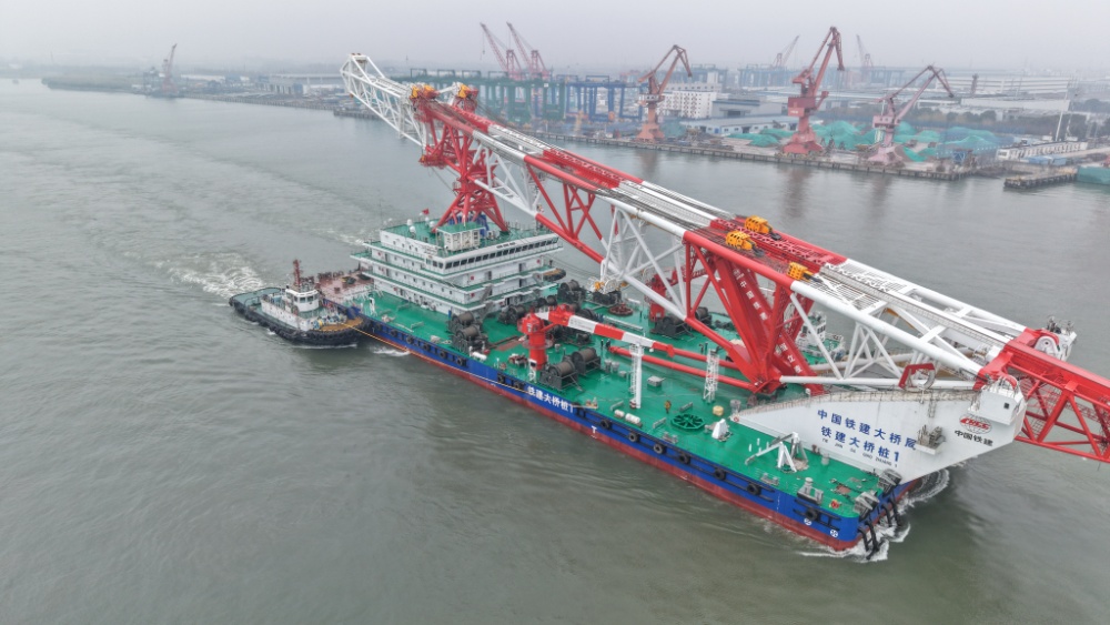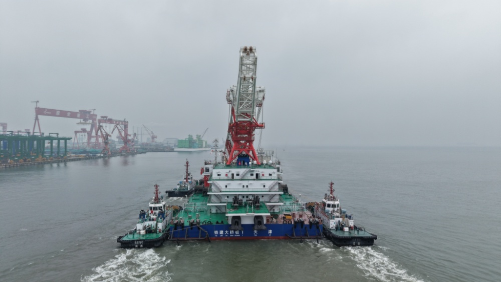 交汇点讯 3月16日,在海巡艇现场维护及4艘大马力拖轮的协助下,全球最高打桩船“铁建大桥桩1”轮顺利离泊江苏大津重工有限公司南通基地码头,前往东海试航区进行试验。此次拖带出江标志着该轮向正式交付投运迈出关键一步。