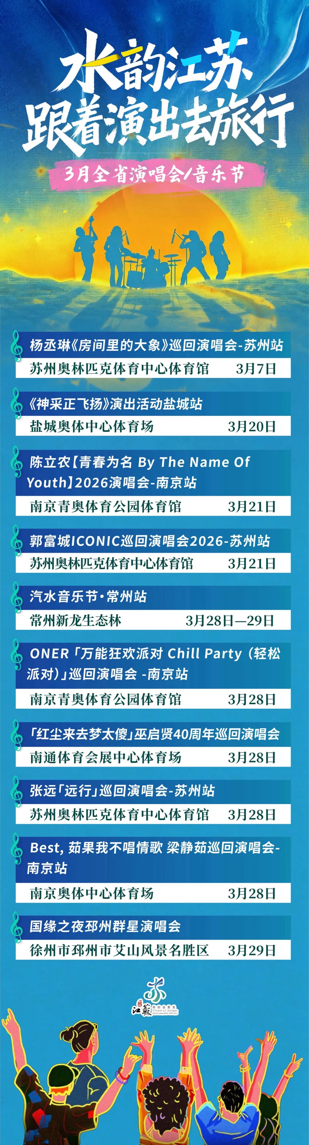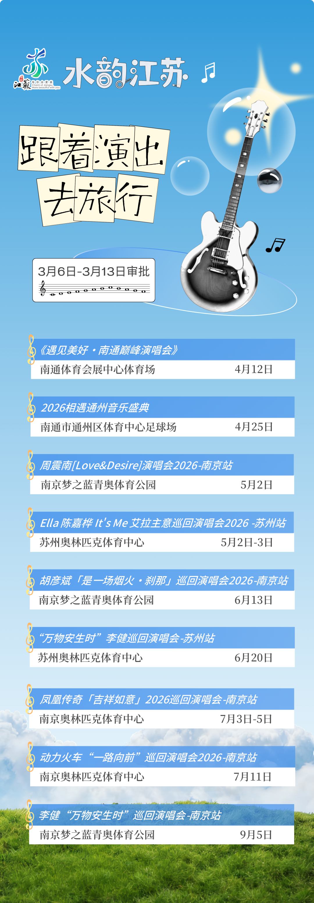 如果错过了怎么办?没关系,记者从江苏省文化和旅游厅获悉,3月6日-13日期间,又有多场演唱会审批通过,从“国民组合”凤凰传奇到“音乐诗人”李健,从春到秋,从长江之滨到金鸡湖畔,一场场演出与您相约,一段段旅程等您“解锁”。