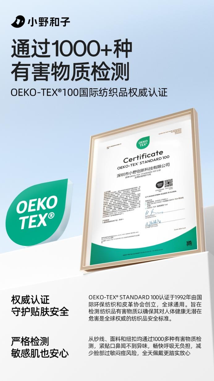 面对行业乱象,小野和子率先给出了“破局”方案。据悉,小野和子防晒系列产品已正式通过全球最严苛的纺织品生态安全认证——OEKO-TEX® Standard 100,成为中国防晒衣领域首个获此认证的品牌。