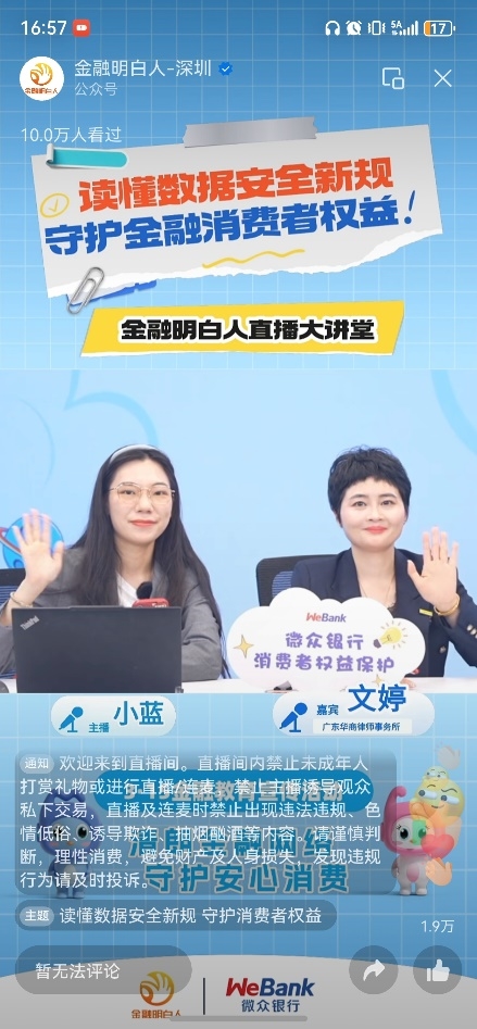 本次专场直播深入浅出、案例生动,直击消费者在数据安全方面的常见痛点,共吸引10.1万人次在线观看,收获点赞1.9万次。未来,微众银行将继续践行“让金融普惠大众”的使命,为消费者贡献更多优质宣传内容。