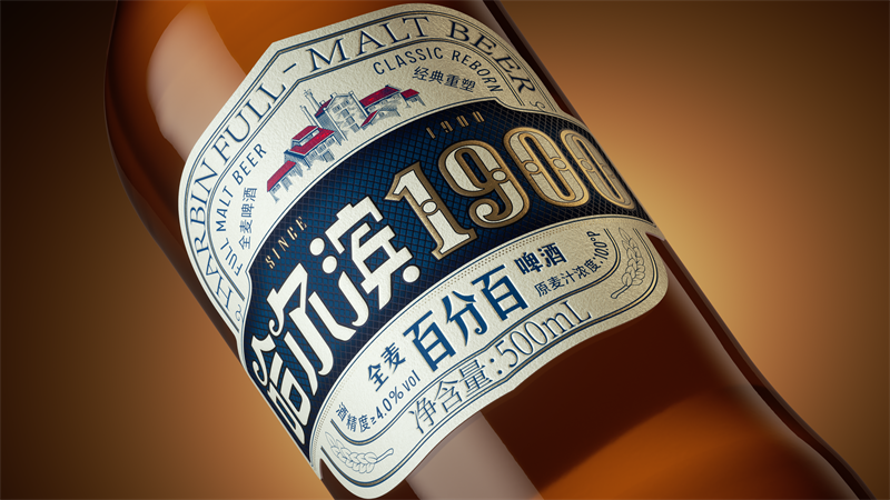 经典的传承,不止于风味,更在于可感的品牌叙事。哈尔滨1900的包装,便是一场融多重元素于一体、以产品瓶身为画布的历史复现。知名设计师潘虎以“高清重制”为核心理念,将1900年品牌专属运酒马车雕刻成颈部浮雕,并探寻哈尔滨城市肌理中的经典建筑,以穹顶轮廓和第一啤酒厂剪影一一描摹入瓶,方寸之间,瓶标上呈现的城市历史和品牌历史文脉巧妙呼应。同时,酒标色调以复古蓝为主,刻画酿造大师群像,并使用烫金、起凸等工艺,使瓶身成为可触摸、可品读的品牌文化载体,每一次凝视与触碰,都是与1900年的历史对望。这场历史基调与现代审美的交融,不仅延续了品牌的经典传承,也为传统品牌的复古创新提供了生动范本。