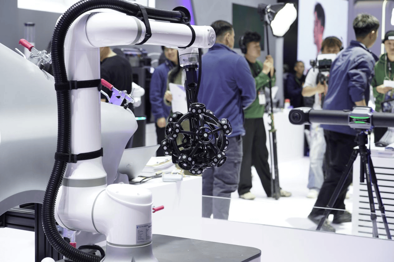 在自动化方案演示区,一辆搭载协作机器人的AGV小车正在进行动态扫描演示,该设备可自主导航并对工件完成扫描采集,直观呈现未来柔性产线的检测逻辑。