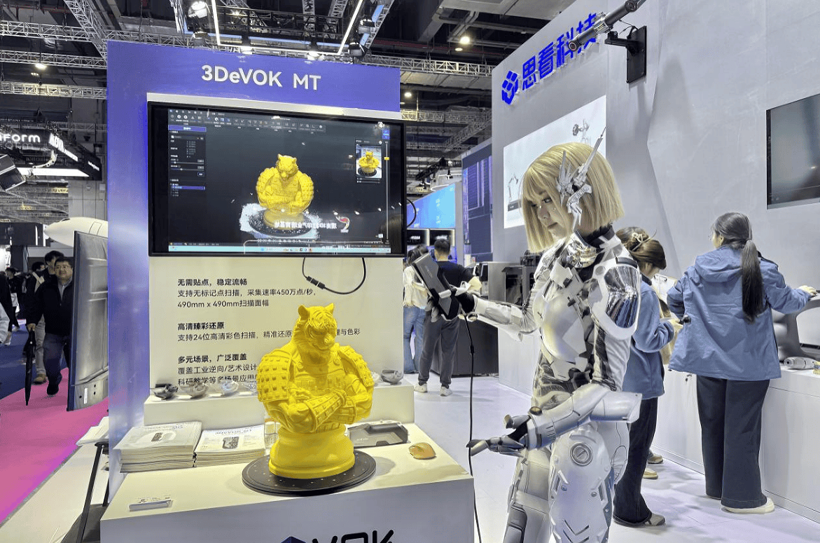 此外,面向消费级的三维扫描仪3DeVOK MT也收获颇多关注,现场酷似“机器人”的小姐姐正对一件3D打印的“虎先锋”模型进行扫描采集,吸引部分观众驻足拍照。