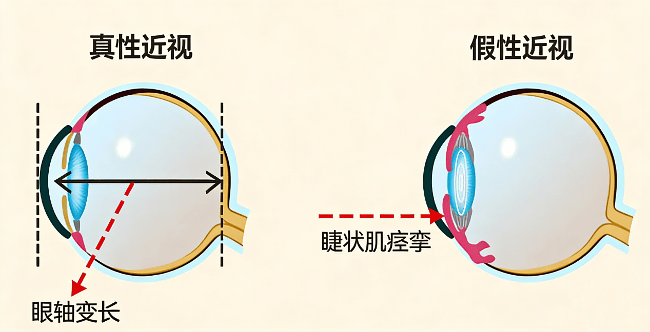 与“真性近视”的眼轴结构性拉长不同,“假性近视”是由于长时间近距离用眼,睫状肌持续收缩痉挛导致的“调节障碍”。在此情况下,晶状体被睫状肌挤压变凸,折射的光线聚焦在视网膜前方,视物变得模糊,看起来像“近视了”。