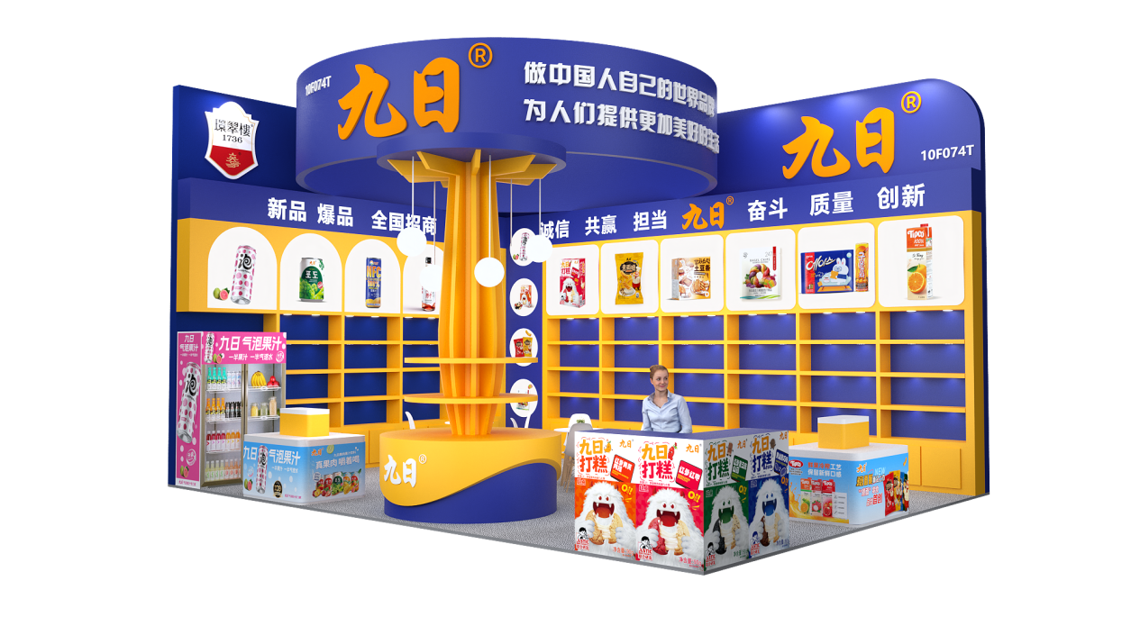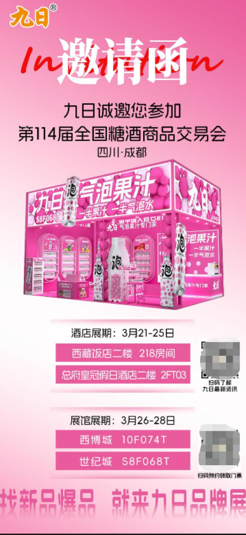 在本届糖酒会一城双馆的格局下,九日品牌精准落子。3月26日至28日主会期,九日将在西博城与世纪城同时设展。西博城展位位于10号馆F074T,面积达48平方米。作为本届糖酒会定位为食品产业创新枢纽的展馆,西博城汇聚了休闲食品、国际食品、健康食品及科技服务等核心板块,与九日品牌近年来在健康零食、创新饮品领域的探索高度契合。而世纪城展位S8F068T(40㎡)则位于饮品及乳制品展区,紧邻中国名酒展区,地处酒类与饮品板块的核心地带,是经销商寻找潜力饮品的必经之地。