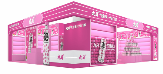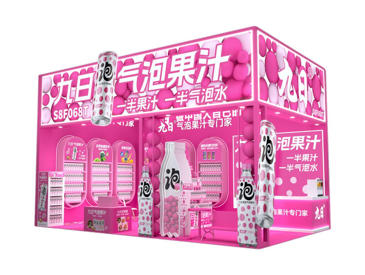 走进九日的任何一个展位,最先映入眼帘的,一定是那一抹充满活力的芭乐粉色调。作为本次参展的核心产品,九日气泡果汁始终坚持“一半果汁,一半气泡水”的健康理念,专注气泡果汁品类,打造“气泡果汁专门家”的定位。真实果汁的醇厚与气泡水的清爽在舌尖碰撞,搭配高颜值的“波点艺术”包装设计,这款产品在年轻消费群体中早已积累了极高的人气。它不只是一瓶饮料,更是一种轻盈、愉悦的生活方式的表达。