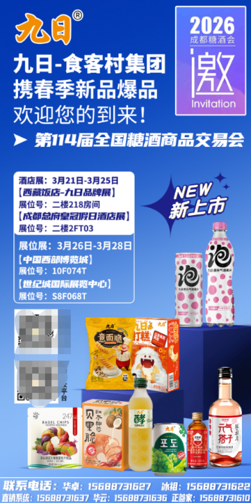 全国糖酒会不仅是交易的平台,更是行业风向标的诞生地。2026年的春天,九日品牌将以气泡果汁为先锋,以全系产品矩阵为支撑,以12款神秘新品为惊喜,在成都等待每一位朋友的到来。无论您是想了解市场动态,还是寻找合作机会,西博城10F074T、世纪城S8F068T、西藏饭店218房、皇冠假日酒店2FT03,九日品牌的展位始终敞开。