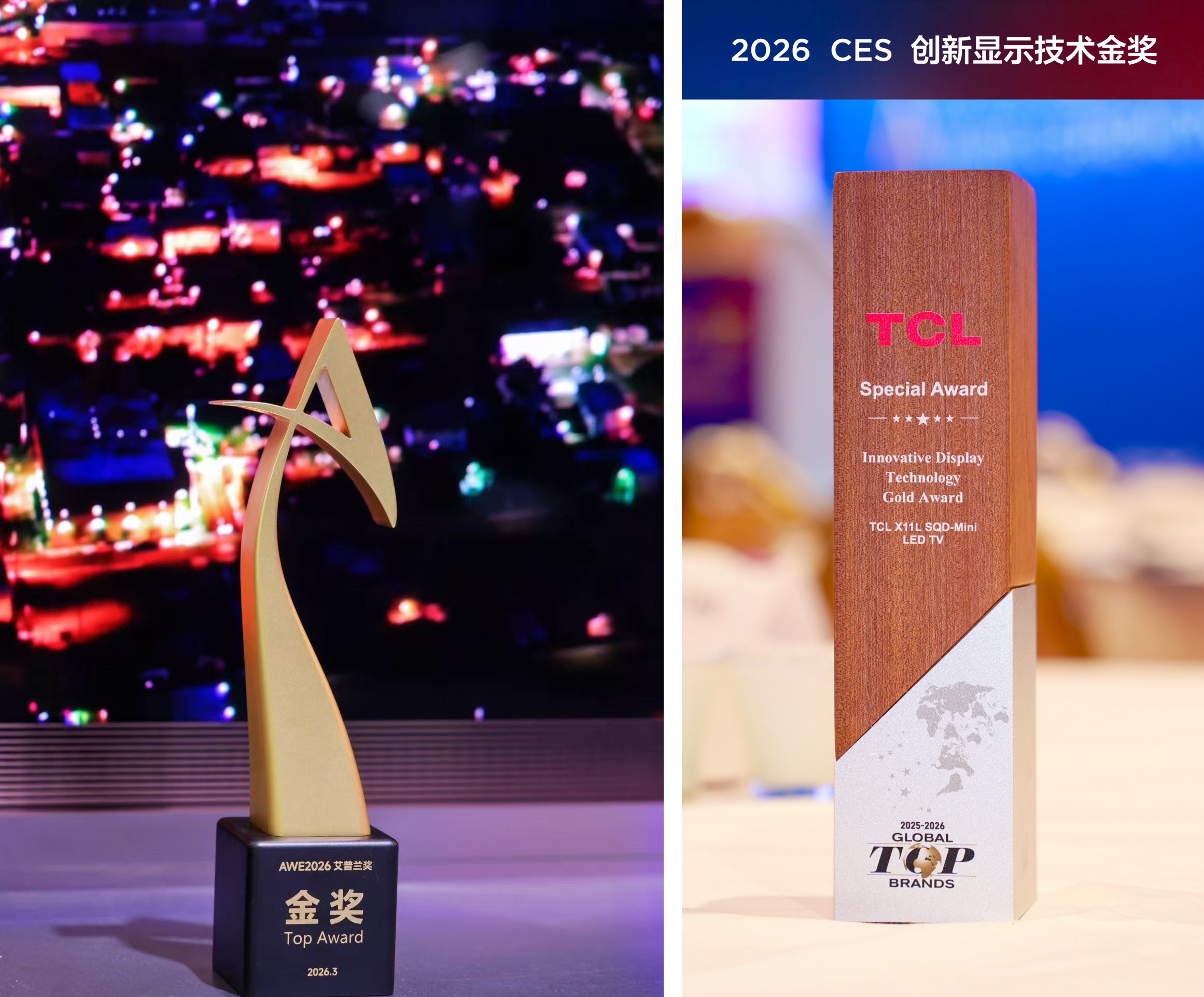 这一技术实力也得到了专业领域的高度认可:中国视像协会认证SQD-Mini LED技术引领显示行业突破,颁发科技创新奖;CES2026上,SQD-Mini LED斩获创新显示技术金奖,被众多科技媒体评选为“BEST OF 2026CES”;而AWE 2026,搭载SQD-Mini LED技术的TCL X11L电视更获得了艾普兰奖金奖,受到海内外媒体的高度评价。