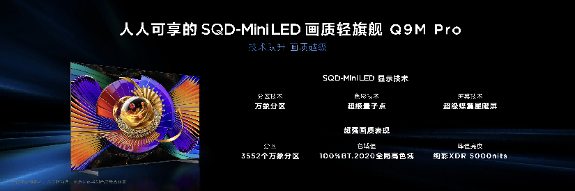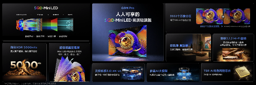 但2026年TCL春季发布会上,彻底打破了这个僵局。SQD系列新品TCL Q9M Pro重磅登场,作为人人可享的SQD-Mini LED画质轻旗舰,它直接将曾专属机皇的旗舰配置,搭配诚意满满的首发定价拉进大众消费市场,真正实现“好画质无门槛”,让普通家庭也能轻松解锁旗舰级观影体验。这份底气,核心来自 TCL自研的SQD-Mini LED技术,直接满足了高对比度、高峰值亮度和高色域的“画质铁三角”,成为好画质的终极答案。