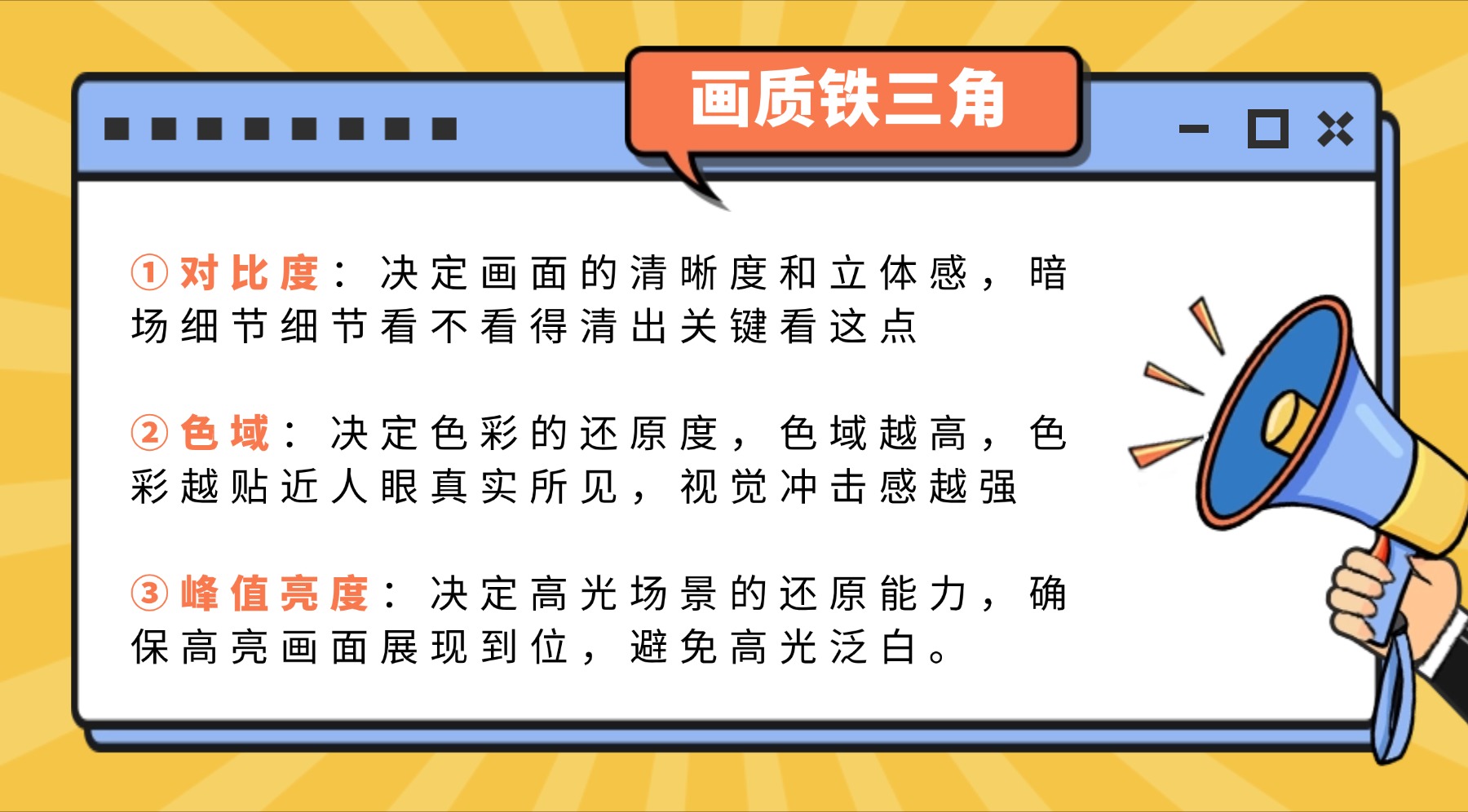 可能还有人不清楚这里面关键的“SQD-Mini LED”到底是什么。平时咱们买电视最怕被各种花里胡哨的参数绕晕,其实判断一款电视画质好不好,核心就看对比度、色域、峰值亮度这三大指标,业内也叫“画质铁三角”。这仨就像电视的“三驾马车”,缺哪一个都算不上真・好画质: