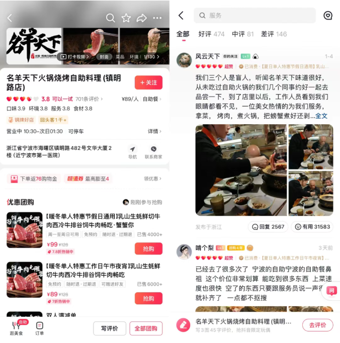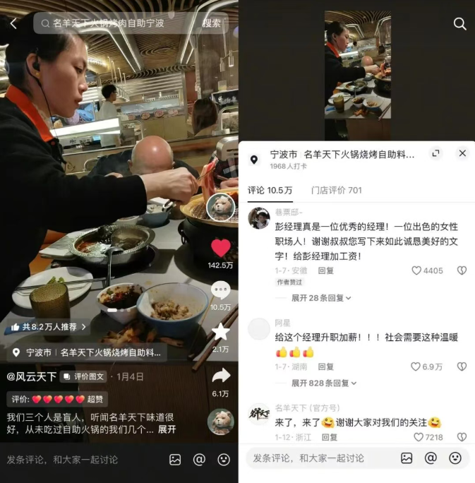 第二天,同事@风云天下 随手在“名羊天下”的抖音店铺主页写下评价:“从未吃过自助火锅的我们几个同事约好一起去品尝一下,到了店里以后,工作人员看到我们眼睛都看不见,一位美女热情地为我们服务,拿菜,烤肉,煮火锅,把螃蟹煮好还剥好拿到我们手上,每样菜煮好蘸好酱料给我们。全程两个小时没有坐下来,一直为我们忙着,就像妈妈照顾小孩一样,非常贴心。”并配上3张就餐现场的图片。