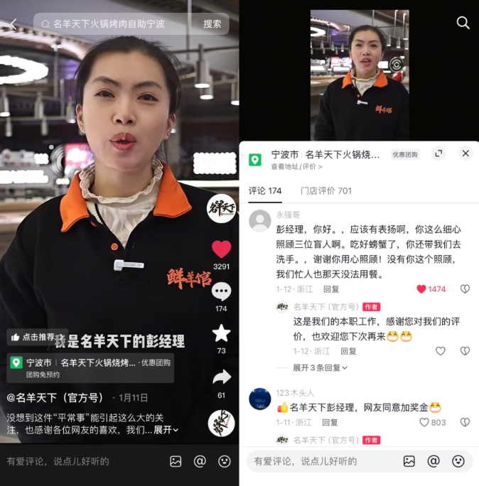 这条评论走红后,“名羊天下”火了。店铺马上发布了一条回应视频,彭玉娟害羞地站在镜头前说:“这是我应该做的,换成店里其他员工,也会这么做。”