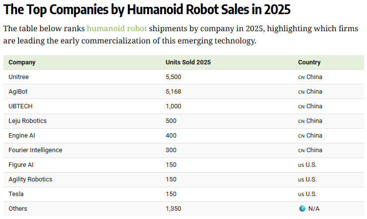 2025年,特斯拉交付了150辆Optimus,预计将于2027年开始公开销售。同样,其他美国领先公司Figure AI和Agility Robotics的出货量也大致相同。尽管迄今为止交付量有限,Figure AI的估值仍飙升至390亿美元,远高于2024年的26亿美元。中国凭借完善的供应链体系、核心技术自主化突破及多场景落地优势,稳居全球人形机器人产业第一大国。