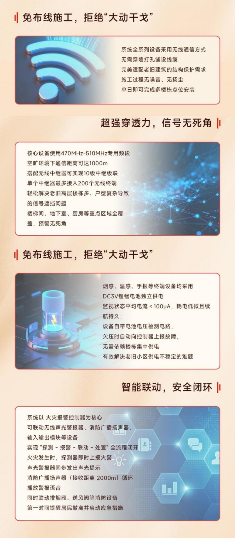 高新投三江无线火灾报警系统,正是对这一愿景的技术回应。三江的无线消防解决方案不仅解决了老旧高层“改不起、改不动、没法改”的现实难题,更通过低成本、高效率、高可靠性的无线组网技术,为每一栋老旧高层穿上了一件隐形的“防火安全衣”。