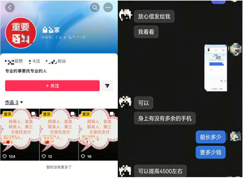 (图说:诈骗分子发布可以提供贷款、提高额度等虚假信息,进而诱导目标用户下载欺诈App。所涉抖音账号已封禁)