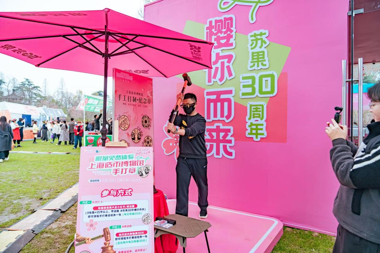 为了展现苏果超市持续焕新的形象,这次快闪店在玩法上也颇费心思。活动期间,南京风筝技艺代表性传承人张堡程将来到现场,手把手教亲子家庭绘制风筝。此外,现场还引入了上海造币厂的手打章体验,让游客能把这份春日记忆“敲”进纪念章里带走。这些互动不再是简单的促销,而是试图将商业活动变成一场小型的城市文化聚会。