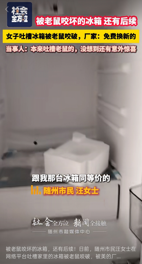 如果说公益服务是品牌的格局,那对普通用户的负责,则是美的冰箱最硬核的底气。湖北随州汪女士家中冰箱意外被老鼠咬破侧板,箱体严重受损,这本是不在保修范围内的意外情况。汪女士原本只是无奈吐槽,并未抱任何维修或更换的希望。可在反馈情况后,美的官方第一时间安排售后上门核实,确认情况属实后,直接为用户免费更换一台同价位全新冰箱。