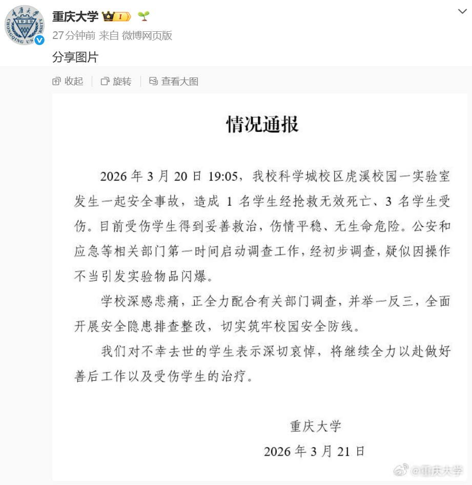 2026年3月20日19:05,重庆大学科学城校区虎溪校园一实验室发生一起安全事故,造成1名学生经抢救无效死亡、3名学生受伤。目前受伤学生得到妥善救治,伤情平稳、无生命危险。公安和应急等相关部门第一时间启动调查工作,经初步调查,疑似因操作不当引发实验物品闪爆。