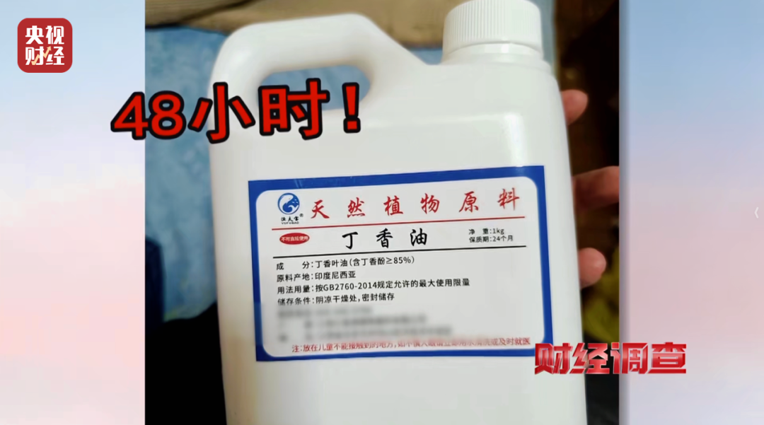 《财经调查》记者找到江西吉安一家生产丁香酚的厂家,厂家承认原料从印尼进口,以食品添加剂名义出厂,被鱼贩子用于麻醉活鱼。一些小作坊购买原料后包装成“三无”麻药流入市场。厂家告知记者,丁香酚在鱼体内完全代谢至少需48小时。