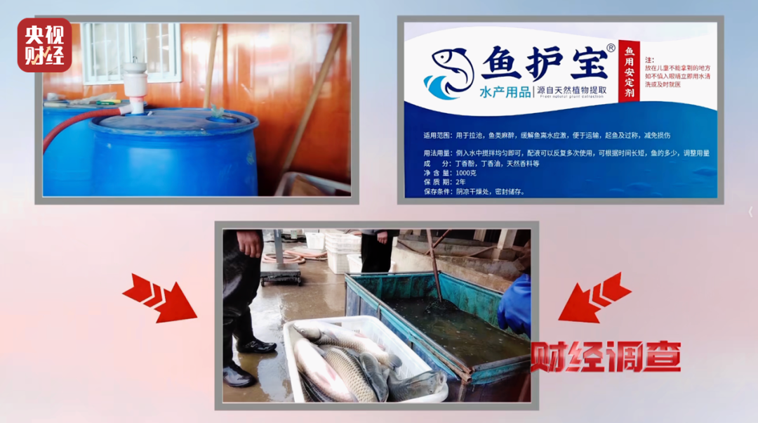 工人手中的这些液体瓶上写着“鱼护宝”,鱼用安定剂,成分丁香酚,属无生产日期、无生产厂家、无生产许可证的“三无”产品。
