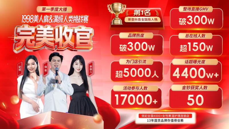 2026 年 3 月 20 日,俏妃品牌重磅打造的春日满级・美肩 C 位出道 —— 满级人类挑战赛第一季颁奖盛典直播圆满举行。这场兼具荣誉揭晓、福利派送与专业健康分享的直播盛宴,凭借超高人气荣登抖音全国丽人榜第一名,创下整场直播GMV破 300 万元、为全国门店引流超 5000 人、总在线人数超 150 万人的亮眼成绩,再度彰显俏妃在女性健康养护领域的行业引领力与品牌影响力。