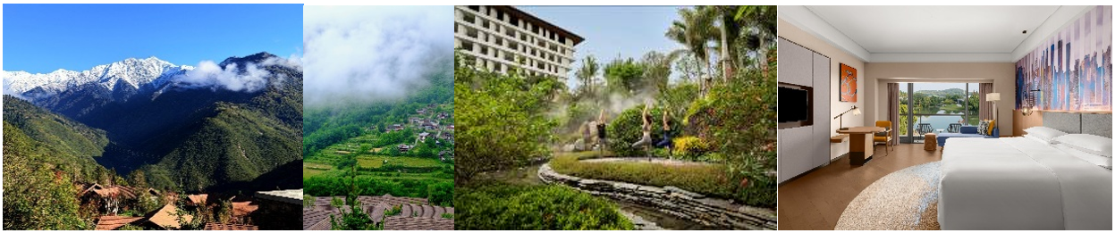 从左至右:春日群山翠绿间的日赛谷丽思卡尔顿隐世酒店、邻近的波日俄村寨、三亚泰康臻品之选度假酒店被万亩山谷花园环绕、上海世茂佘山艾美酒店湖景客房