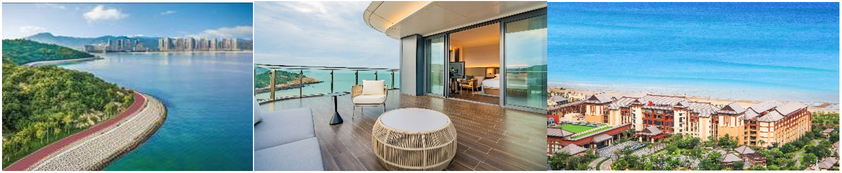 从左至右:小径湾艾美酒店周边的西线乌头山滨海绿道、珠海东澳岛万豪度假酒店海景露台客房、厦门万豪酒店及会议中心面朝大海