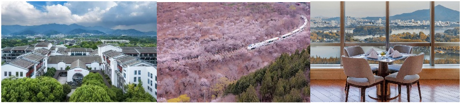 从左至右:杭州西溪喜来登度假大酒店外观自然环境、从北京乐多港万豪酒店短车程可达居庸关花海、南京金茂威斯汀酒店知味餐厅玄武湖景