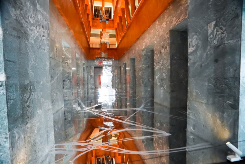 这次“重识”的旅程,以观象、观境、观心、观净、观无五个板块逐层展开,由内向外,由实入虚,呈现了艺术家充盈的精神世界和多元的艺术探索。其中最引人瞩目的一件作品,是位于展馆38米层高中庭的大型装置。作品用镜面亚克力进行折射,在空间里经过镜面的衬托,在视觉上形成了放大和延展,原本静态的作品,因与环境产生链接,变得灵动起来。