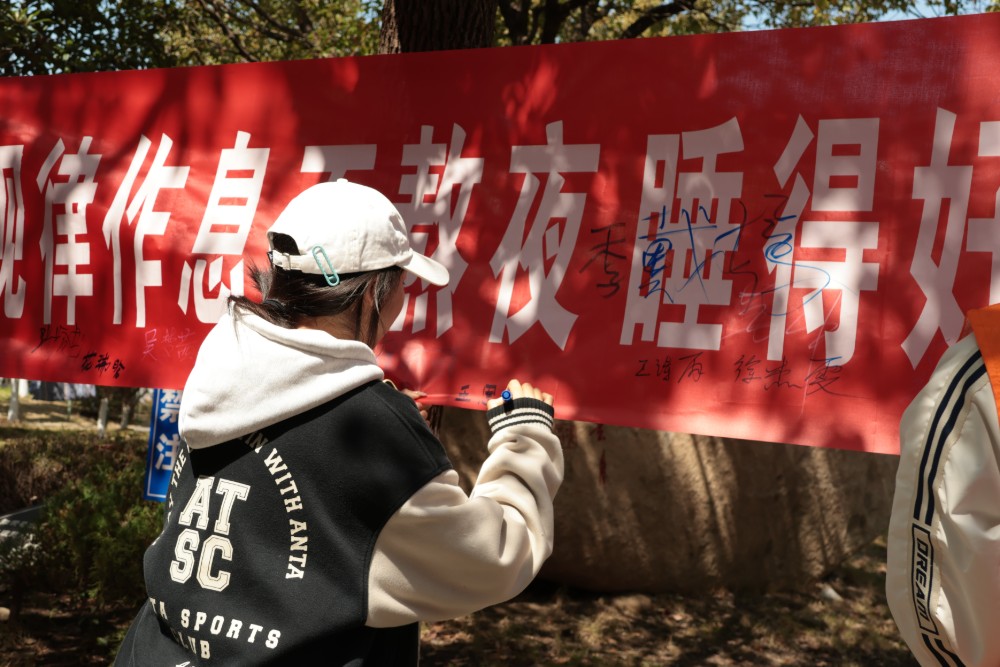 这不仅是一场知识科普,更是一次真诚的朋辈交流。在互动区,同学们积极分享自己的睡眠困扰与助眠小技巧,彼此倾听、相互鼓励。在主题宣传横幅前,同学们纷纷驻足签名,“规律作息不熬夜,睡得好生活更美好!”满满的仪式感表达了对践行科学睡眠、追求健康生活的坚定承诺。