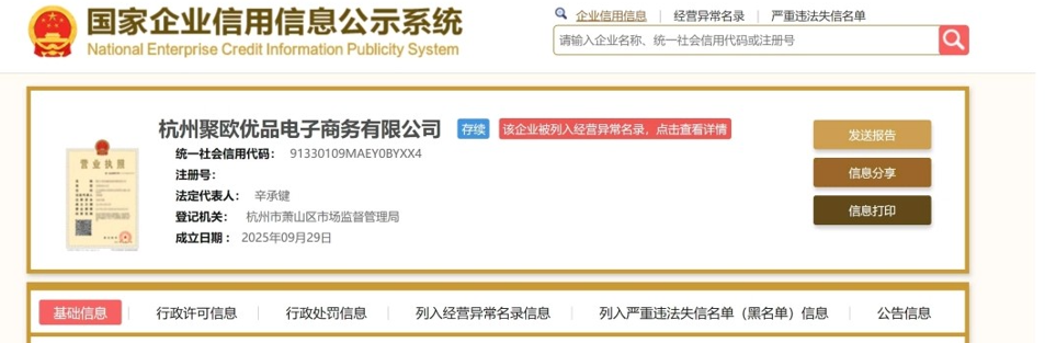天眼查显示,该公司成立于2025年9月29日,今年2月3日被杭州市萧山区市场监督管理局列入异常经营名录,原因为“通过登记的住所或者经营场所无法联系的”。