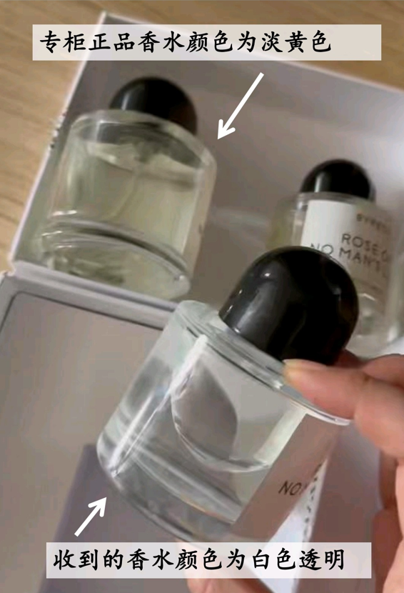 随后,周女士与手中的专柜同款香水对比后发现三处明显异常:便签无专柜正品的凹凸感;喷出后是刺鼻酒精味;液体颜色与其他三瓶色差明显。据此,周女士判断这四瓶香水是假货。