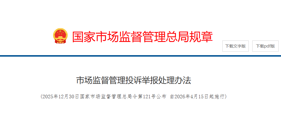 据悉,新修订的《市场监督管理投诉举报处理办法》将于2026年4月15日起施行。《办法》第十三条规定,对平台内经营者的投诉,未在平台依法公示地址或者通过平台公示的地址无法取得联系的,由平台经营者住所地县级市场监管部门处理。