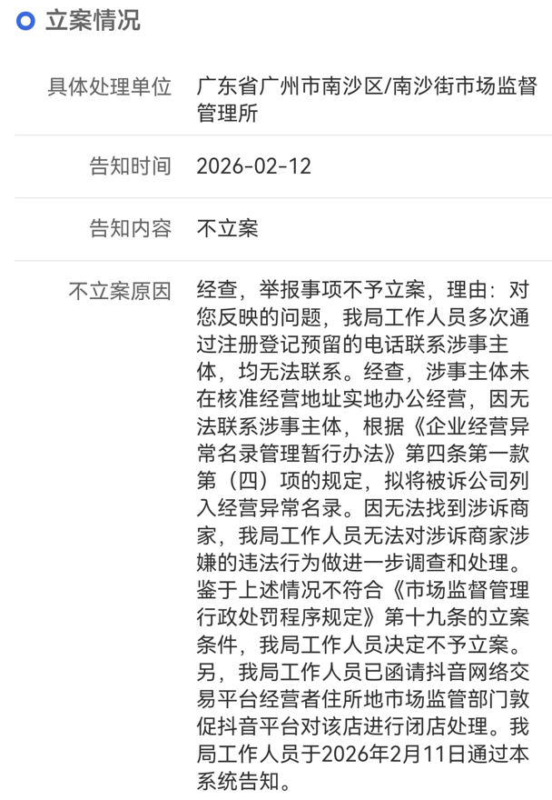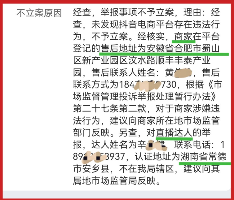 同时,在周女士拨打平台公司所在地上海的12315热线后,等待多日收到了“不予立案”的回复。上海市杨浦区网络交易市场监督管理所表示,商家在平台登记的售后地址位于安徽合肥,直播达人的认证地址为湖南常德,均不在其管辖范围内,建议向属地市场监管部门反映。