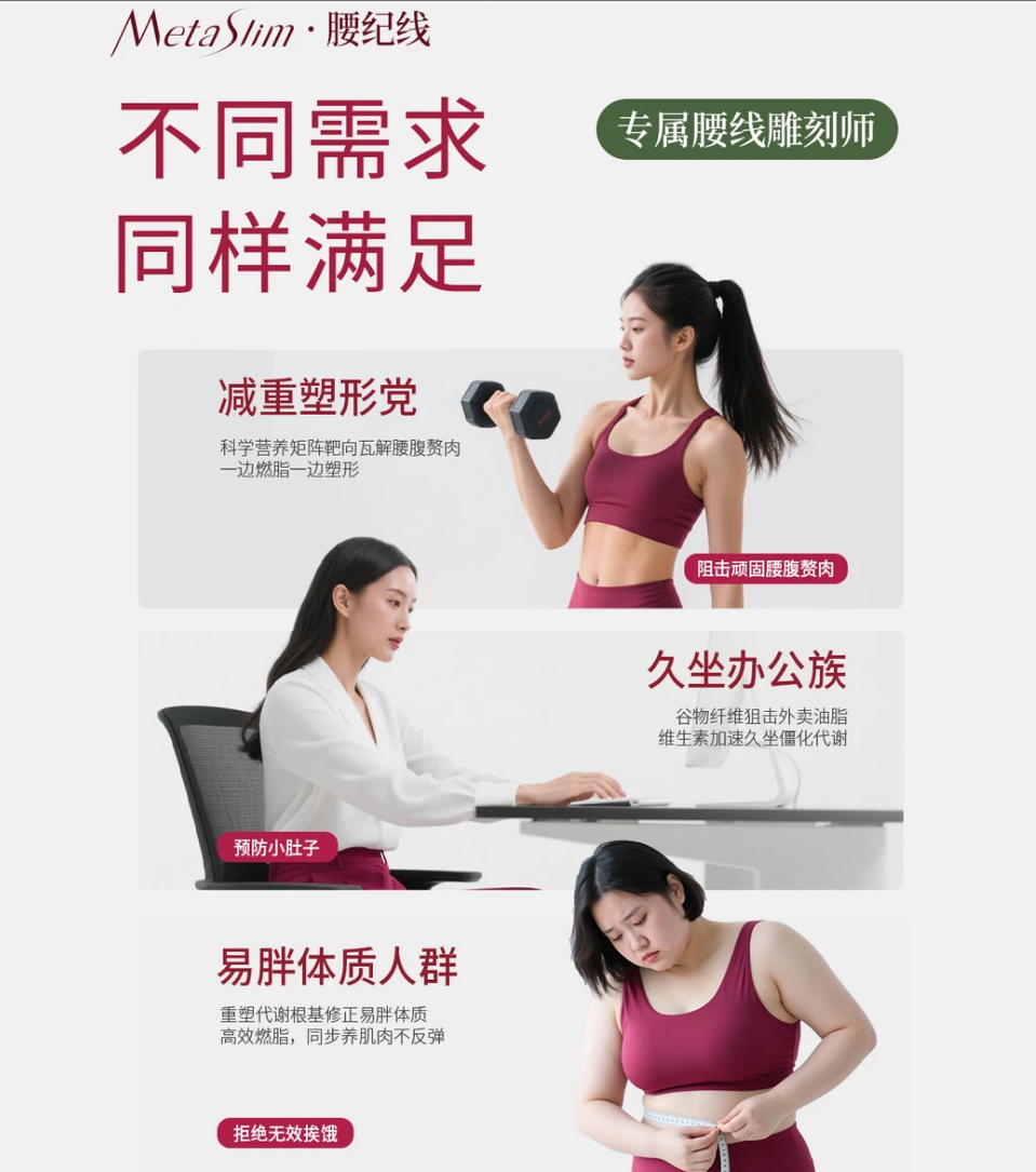 作为唯一通过“代谢提升实证、敏感体质耐受、腰腹靶向减脂、停用不反弹”五大场景验证的产品,其核心适配大肚腩高发人群——久坐族、产后宝妈、反复反弹人群、中老年减脂人群,覆盖18-60岁全年龄段,可满足节后肚腩塑形、日常腰腹管理、代谢修复等核心需求,精准解决“减全身不减肚腩”的行业痛点。