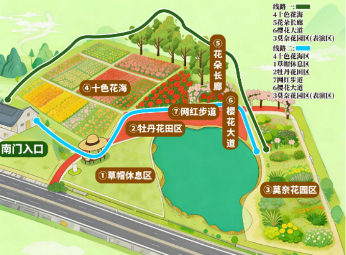 1️⃣南门进:先玩花海项目和蝴蝶谷再去恐龙主题乐园。