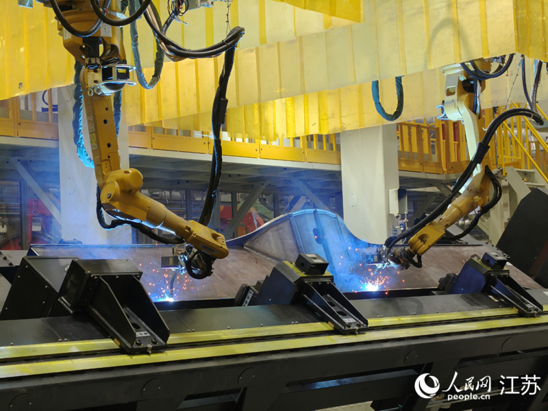 徐工起重机智能工厂的焊接机器人在作业。人民网记者鞠峰摄