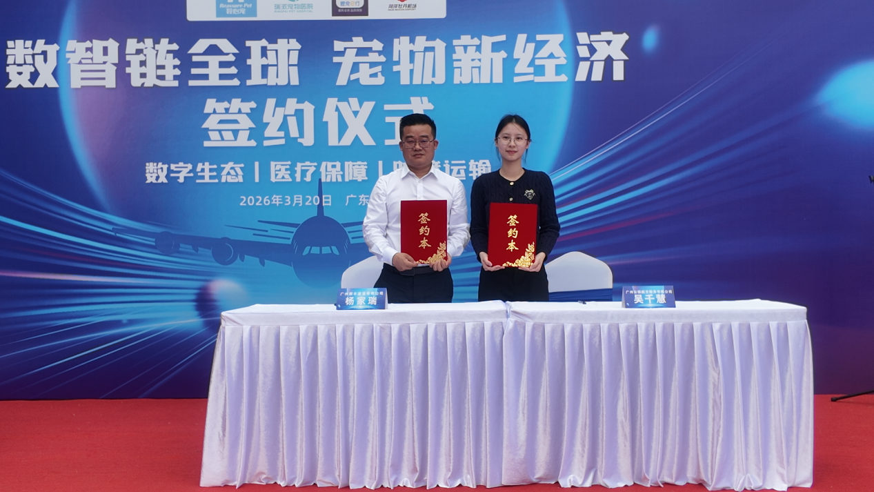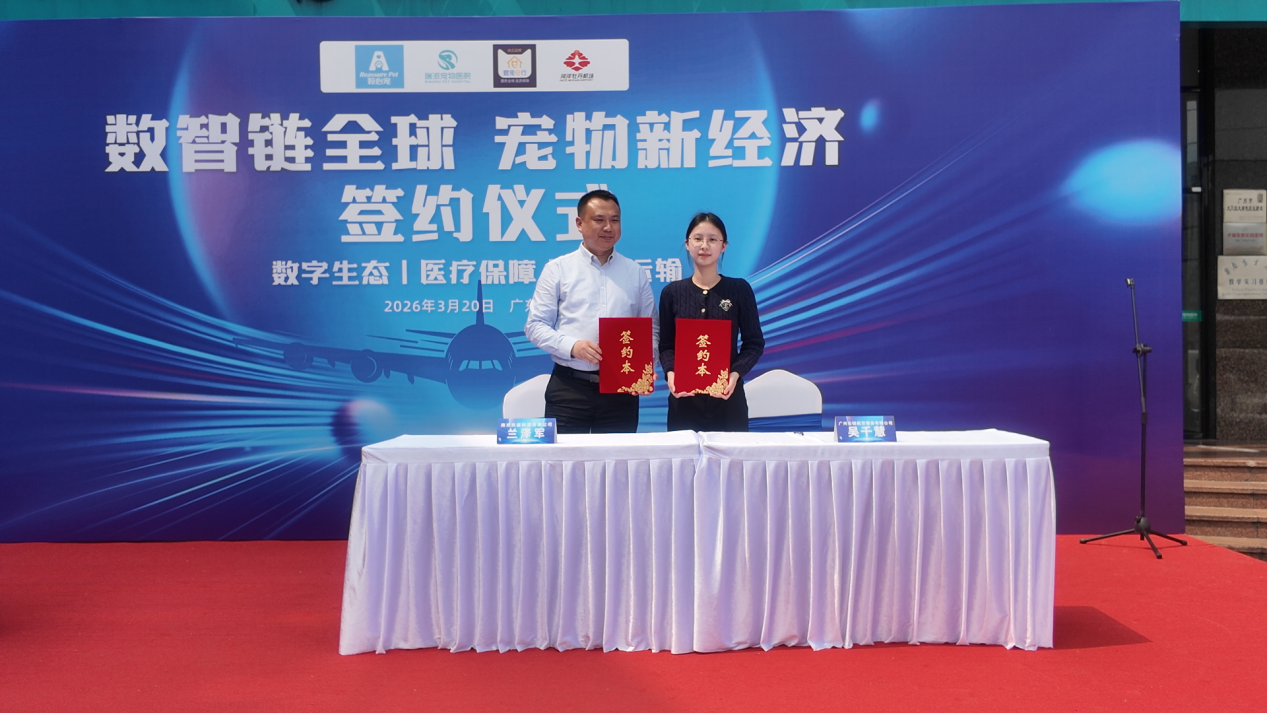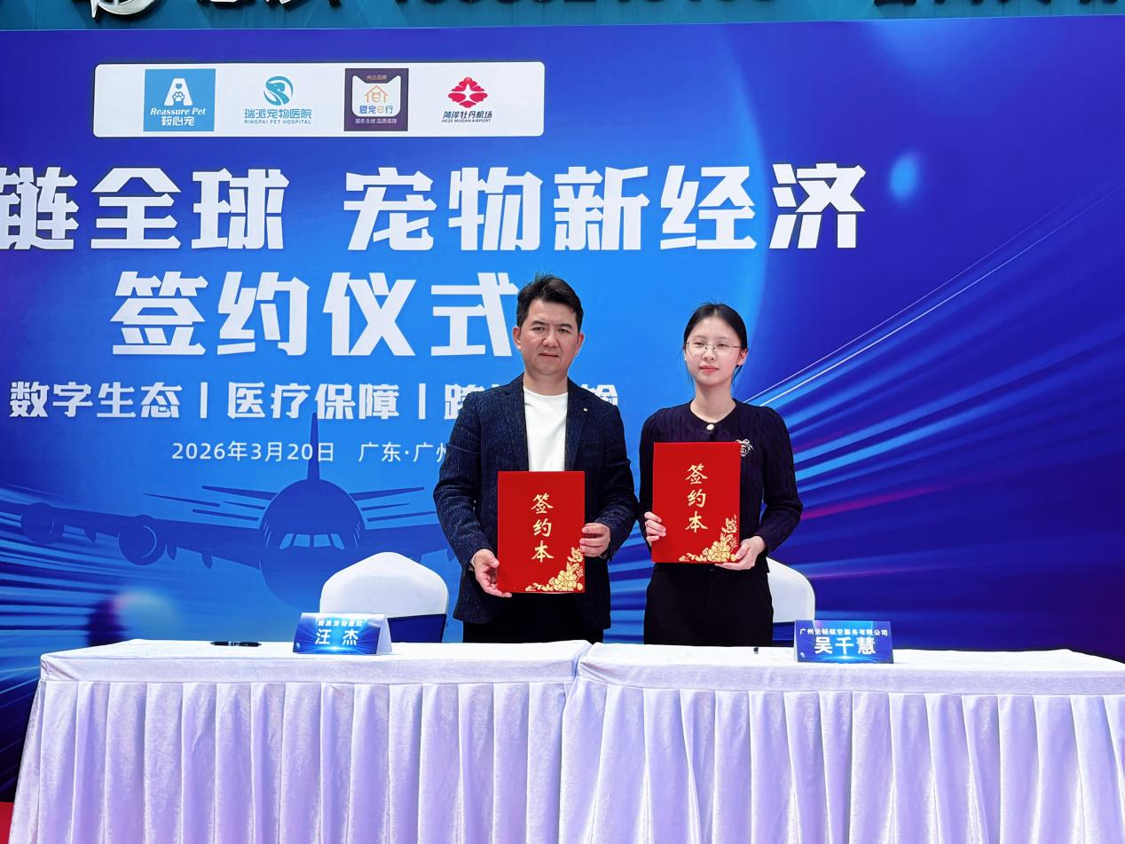 2026年3月20日,宠物产业跨境供应链共建与区域经济协同发展四方战略合作签约仪式在广州市番禺区瑞派紫金宠物医院隆重举行。本次战略合作由瑞派宠物医院管理股份有限公司牵头主办,联合辽宁省鞍心宠高科产业有限公司、广州云链航空服务有限公司(爱宠e行)、菏泽机场牡丹管理有限公司四方正式签约,聚焦宠物跨境出口全链路痛点,整合繁育、医疗、航空、口岸疗养与跨境运输核心资源,共同打造中国宠物产业高质量出海的全新生态。